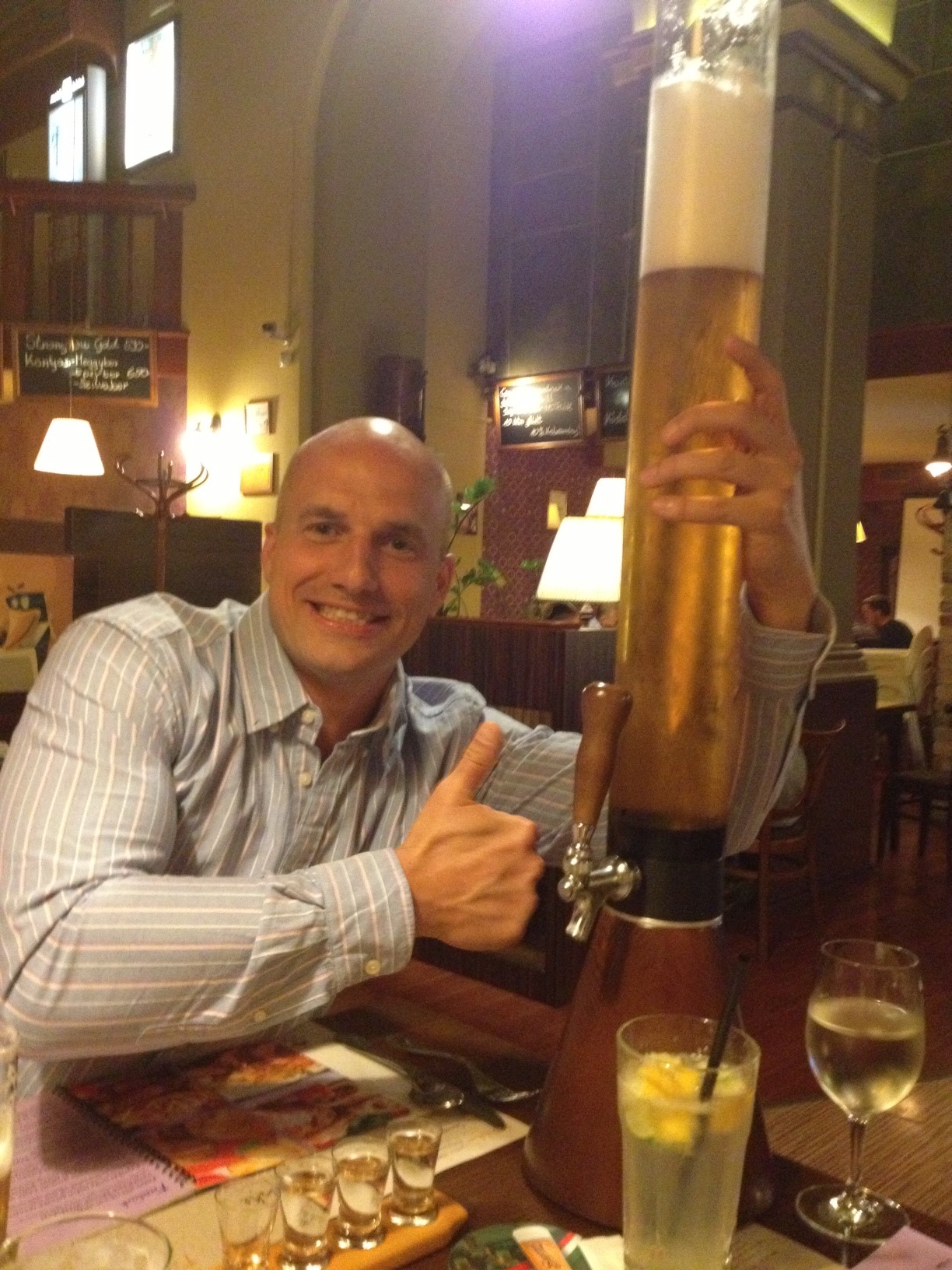 But the biggest surprise I got was from one of our friends ... ordering a ... very large beer? I hope the picture speaks for itsself, but I will try to explain anyhow. The lower part is made out of wood and contains a tap. The part above is made out of glas or plastic and holds about 3 litres of draught beer. It is brought to your table so you can "draft" your own beers.