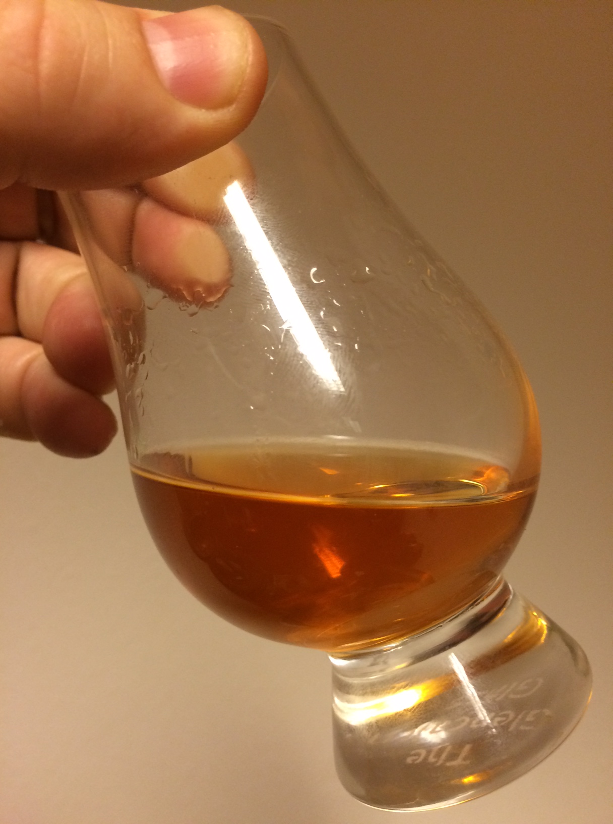 To make up for not being around much for about a week, I post a picture of my rye bread whiskey. Aged on heavily toasted American white oak. The picture does not do justice to the beautiful red/brown colour ... and it is a darn nice drop!