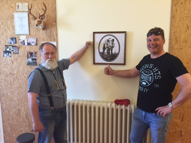 Lajos and Odin in front of the Gemenc Distillery's logo ...