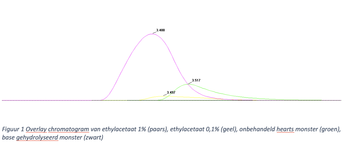 A chromatographic overlay of a 1% ethyl acetate solution (a heads faction) in purple, a 0.1% ethyl acetate solution in yellow, an untreated heads sample in green, and the black line (look careful!), that signifies the heads sample after treatment with Willem's Miracle Powder (aka sodium hydroxide):