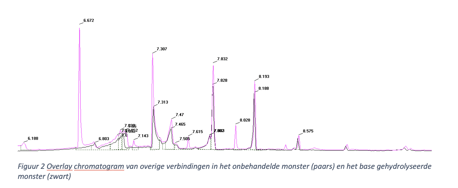 But that is not all! How does the procedure do against other heads and tails flavors? Well, here is the outcome of further CG analysis. In purple you see the various esters available in an untreated heads and tails sample. The black, line that is significantly lower, represents the ester count after the purification procedure: