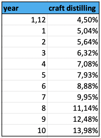 Craft Beer has been around for a decade longer than craft distilling. Their growth curve and our industry's growth curve match very well. The market share value of Craft Beer is currently around 12,5%. It is therefore expected to see the craft distilling industry grow with similar numbers. Given a 12% growth, year over year, a market share of 14% is obtainable within a decade. As follows: