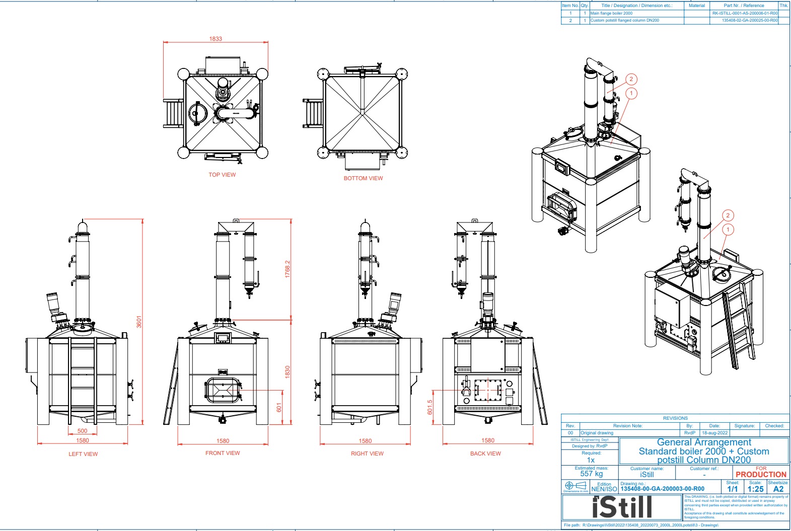 And technical drawings of their 2000 liter iStill Potstill with custom riser and bridge ...