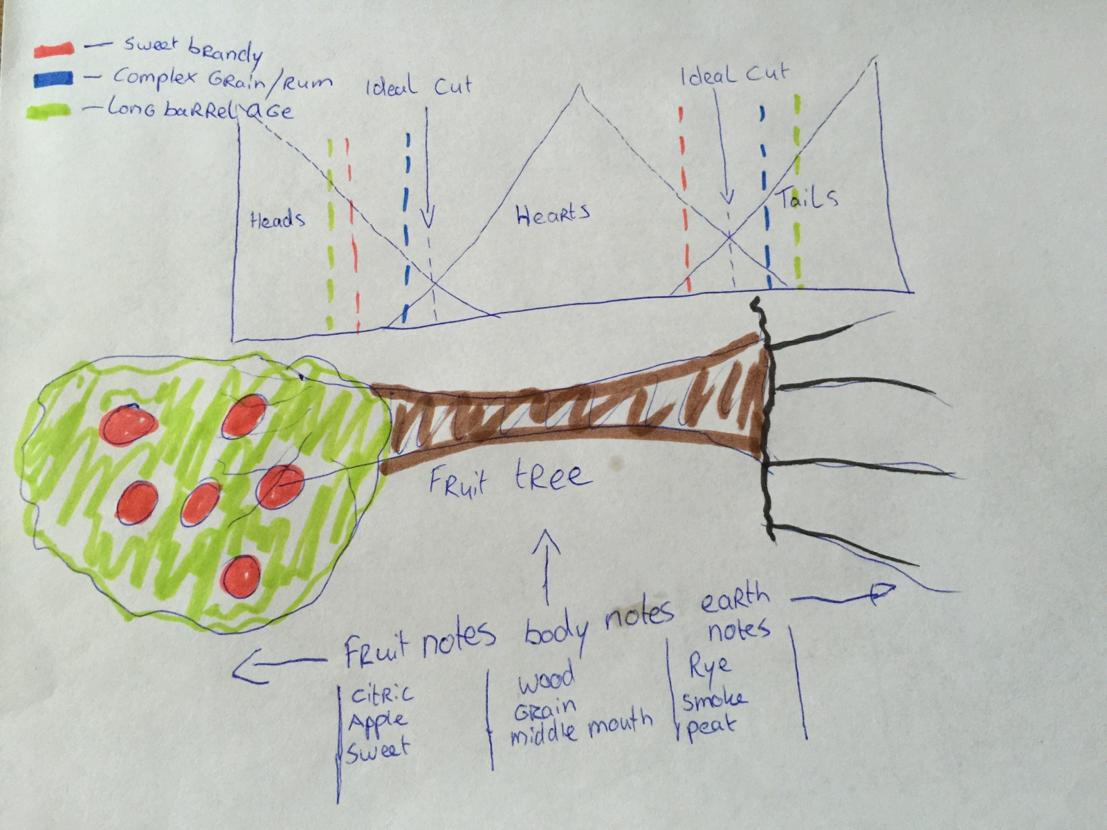 So, we expect the Bourbon to be relatively fruitier, as the front-end flavors make up more of the total flavor profile. Heads smearing attributes 30% of flavor, hearts just 20%, and tails as much as 50%. An expected absence of tails makes the Bourbon the lighter, sweeter, and fruitier product. The MacAllan is made on a traditional potstill. An old technology that is great at smearing heads and tails into the hearts cut. So, again, we expect the MacAllan to have a bigger first and third dimension than the Jim Beam.