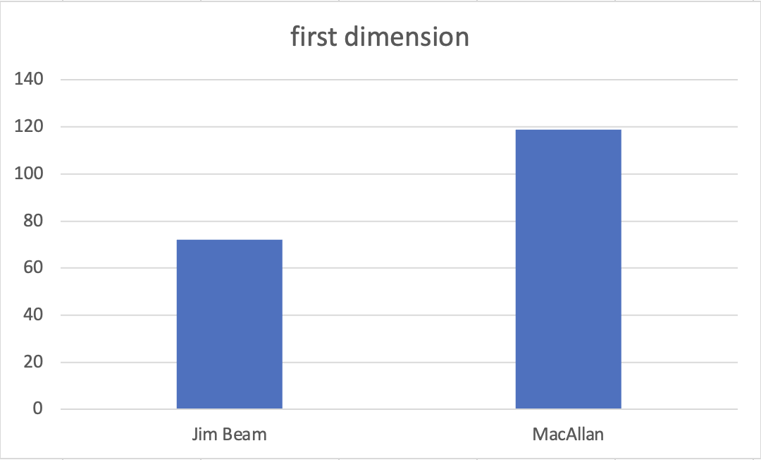 So, we expect the Bourbon to be relatively fruitier, as the front-end flavors make up more of the total flavor profile. Heads smearing attributes 30% of flavor, hearts just 20%, and tails as much as 50%. An expected absence of tails makes the Bourbon the lighter, sweeter, and fruitier product. The MacAllan is made on a traditional potstill. An old technology that is great at smearing heads and tails into the hearts cut. So, again, we expect the MacAllan to have a bigger first and third dimension than the Jim Beam.