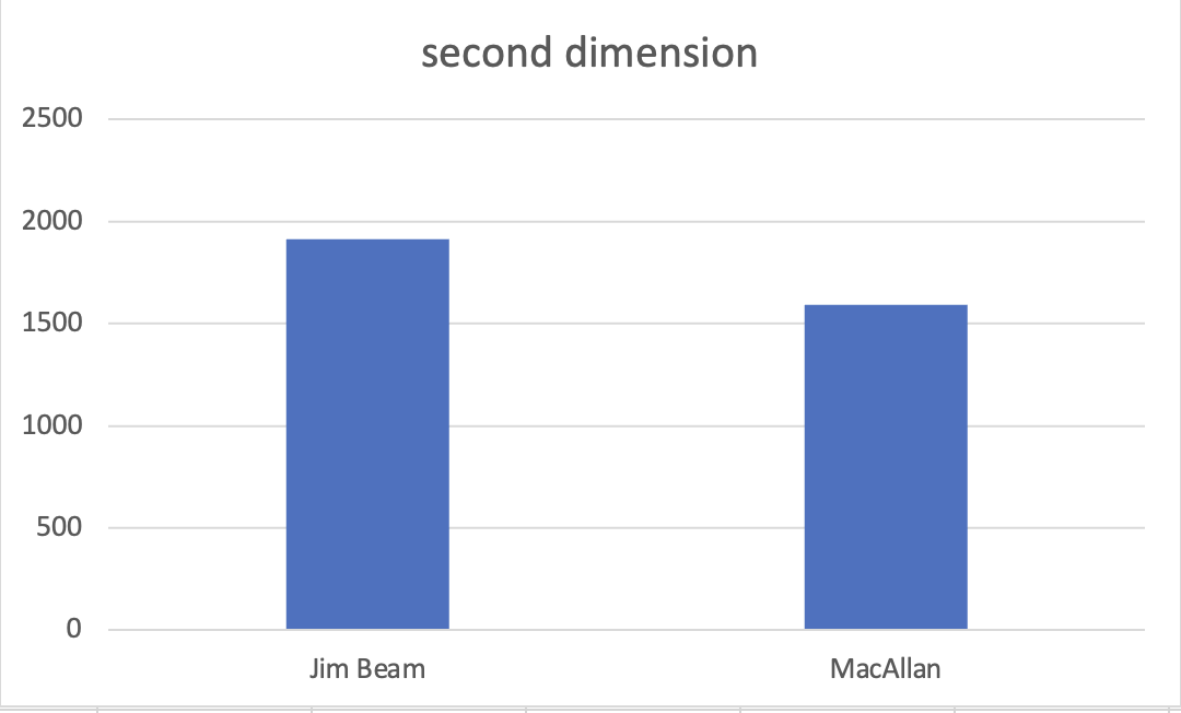 As predicted by the model, the MacAllan has a more flavorful first dimension. Jim Beam hits the market after four years of barrel maturation. They make a tighter hearts cut with less heads smearing, simply because there isn't enough time for a bigger heads smearing to mellow out. The MacAllan hits the market after over a decade. There is much more time for the bigger amount of heads smearing to mellow out over time. Put differently: MacAllan takes advantage of its prolonged maturation time via the incorporation of more heads, resulting in a bigger overall flavor profile, at least at the front. Jim Beam applies a similar flavor maximization strategy: given the limited amount of maturation time of four instead of 12 years, they still achieve an impressive result of about 60% of front-end, fruity flavors of the MacAllan.
