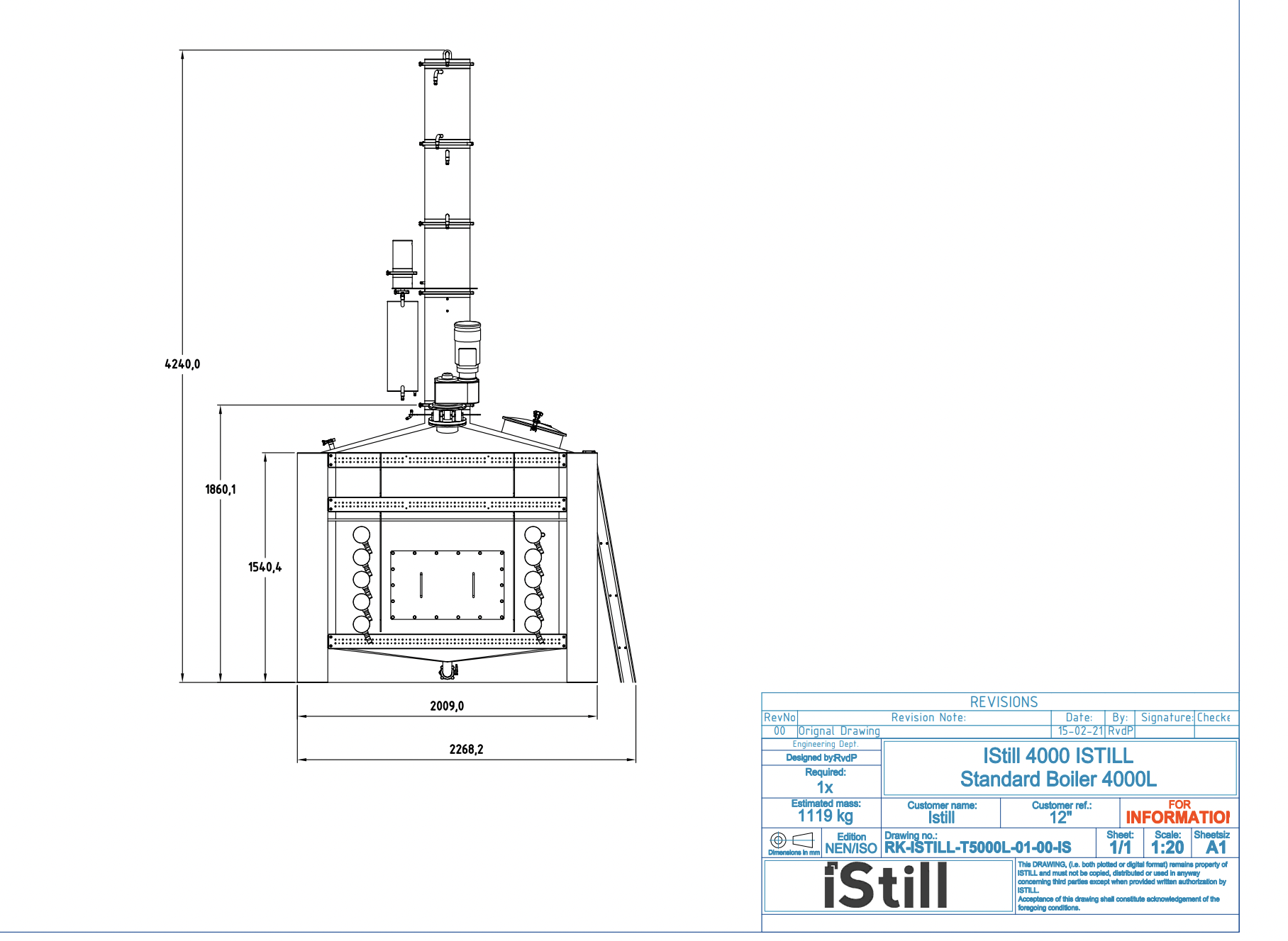 We are currently working on a special project for an American customer that was very much height restricted in their distilling hall. To help them out, we designed a lower boiler. Here it is: a special project iStill 4000, with the performance of an iStill 5000!