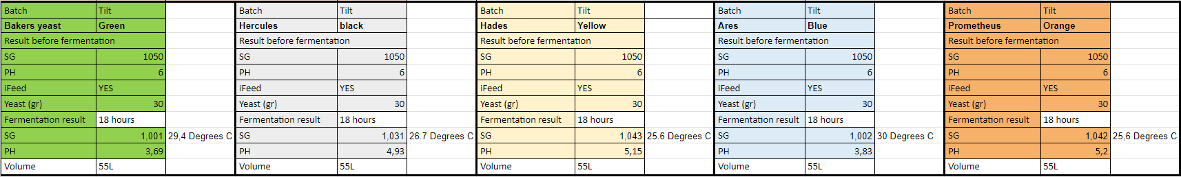 The differences in temperatures, pH-ranges, and sugar to alcohol conversion speeds are quite remarkable! Based on the first results (see above, and note that the fermentations are not ready yet - well most of 'm aren't), what do you expect for yield and flavor profile? If you want to share your predictions and reasoning, don't hesitate to post underneath.