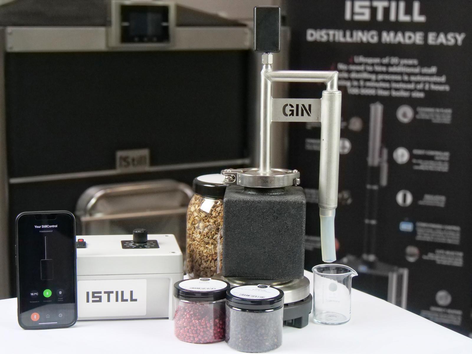 The iStill Nano is a small, one liter big still. It distills half a liter of gin in like an hour. It comes with a power manager, a hotplate, our bluetooth thermometer, and the StillControl App. Making a bottle of spirit has never been easier!