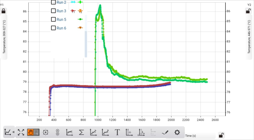 The SPP run is in green. The top line depicts the temperature readings of T3, the bottom line shows what thermometer (T4) measures. iStill's HCP is shown in purple and blue. Purple is T3, blue are the readings of T4.