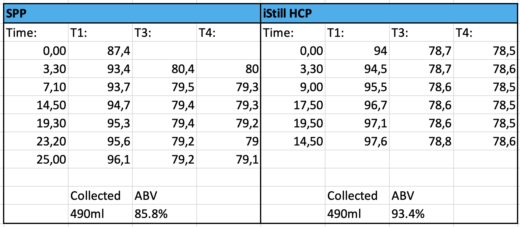 We then repeated the exact same run with iStill HCP in the column instead of SPP. The exact same boiler filling of 10 liters at 10%. POM nr. 2, and 50% or 2 kWh of power. The results? The outcome is quite shocking. See the graph underneath: