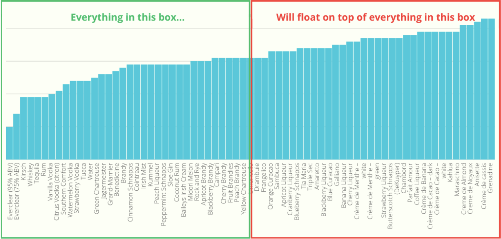 Not all drinks are created equal. They differ in color, in alcohol percentage, and - in this case most importantly - specific gravity. Why gravity matters? Well, the more sugar is added to a drink, the higher its gravity. And the higher the gravity, the bigger the density.