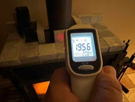 The stones radiate for about 6 hours after the fire has gone out and are still hand warm. It was 22.5 degrees Centigrade in the living room all night and morning. When I got home this afternoon at 6:00 PM, after work, it was still 21.5 degrees. Without the heating on. Simply as a result of the stove, which I stoked up the night before. It is now on again. I measure stone temperatures of about 140 to 195 degrees. 140 if you stoke a bit less hard and 180 to 195 if you stoke harder. In practice, this means a maximum energy storage capacity of 70 kWh, a minimum energy storage of around 40 kWh, and an average storage of approximately 50 to 60 kWh.