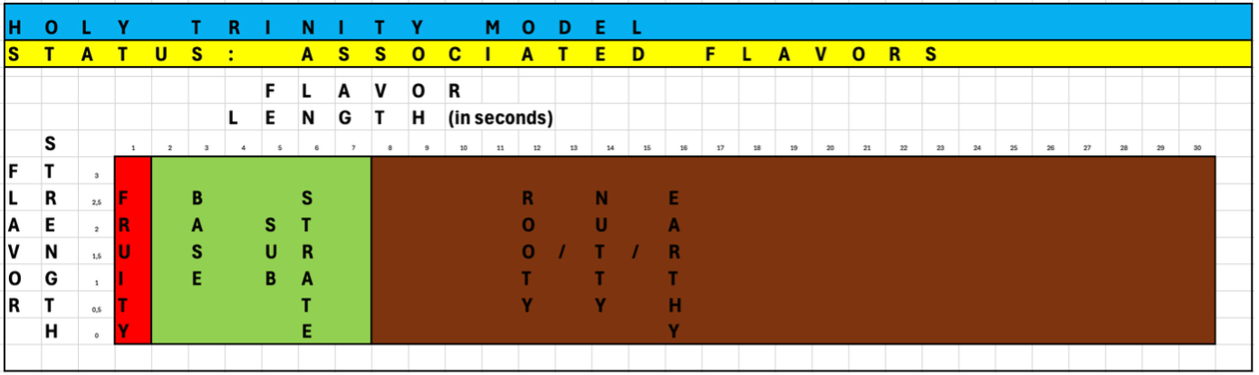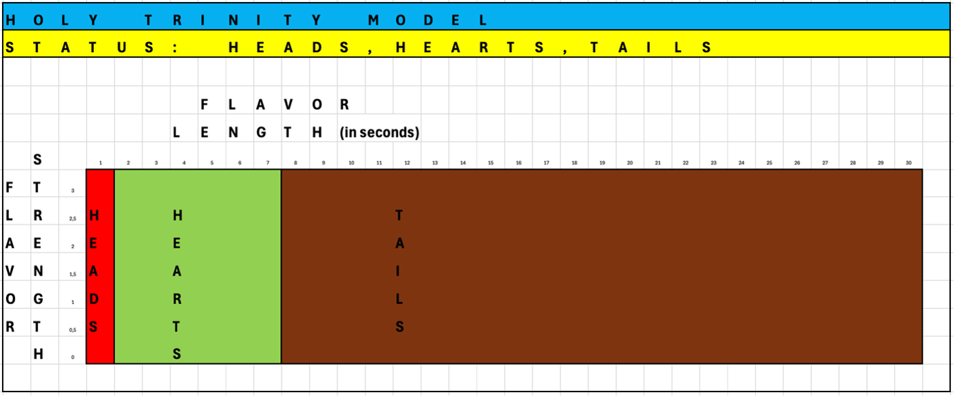 In its totality, we see a inversed on-ramp and off-ramp. Dimensions 1 and 3 are stronger than dimension 2. Please remember that heads and tails already are higher in flavor count, as – together – they provide 80% of flavor.