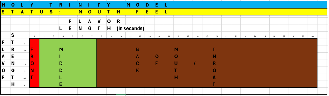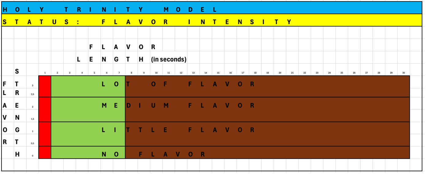 Odin’s Holy Trinity of Distillation distinguishes between “no flavor”, “little flavor”, “medium flavor”, and “a lot of flavor”. After first assessing how long the flavors last, now take a second sip, wash your mouth with it, swallow, and assess – with your mouth closed – what flavor intensity you get during the first second, from seconds 2 until 7, and from second 8 onwards.