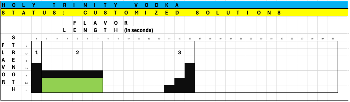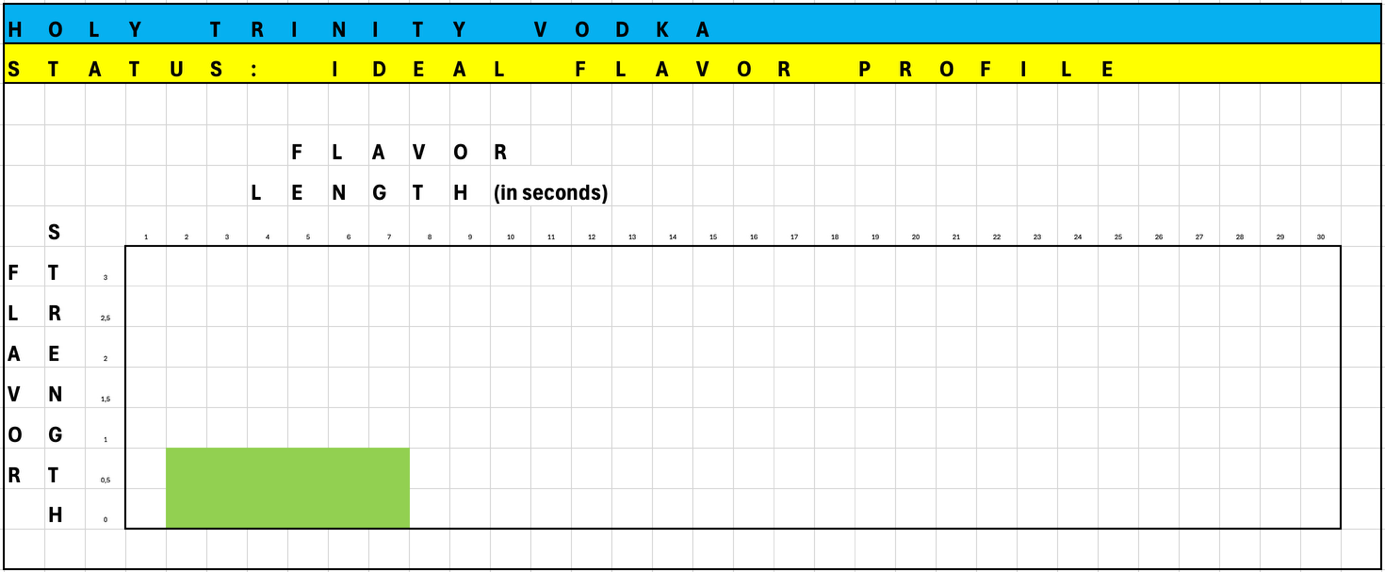 Voila, Odin’s Holy Trinity of Distillation teaches us how to taste! A spirit can provide flavors in three dimensions (heads, hearts, tails), that can be tasted on different time-slots, in different parts of your mouth, and that have a specific flavor strength (none, light, medium, heavy) and flavor qualification (fruity, substrate, rooty & nutty flavors). Now, let us apply what we have learned to the potato vodka at hand.