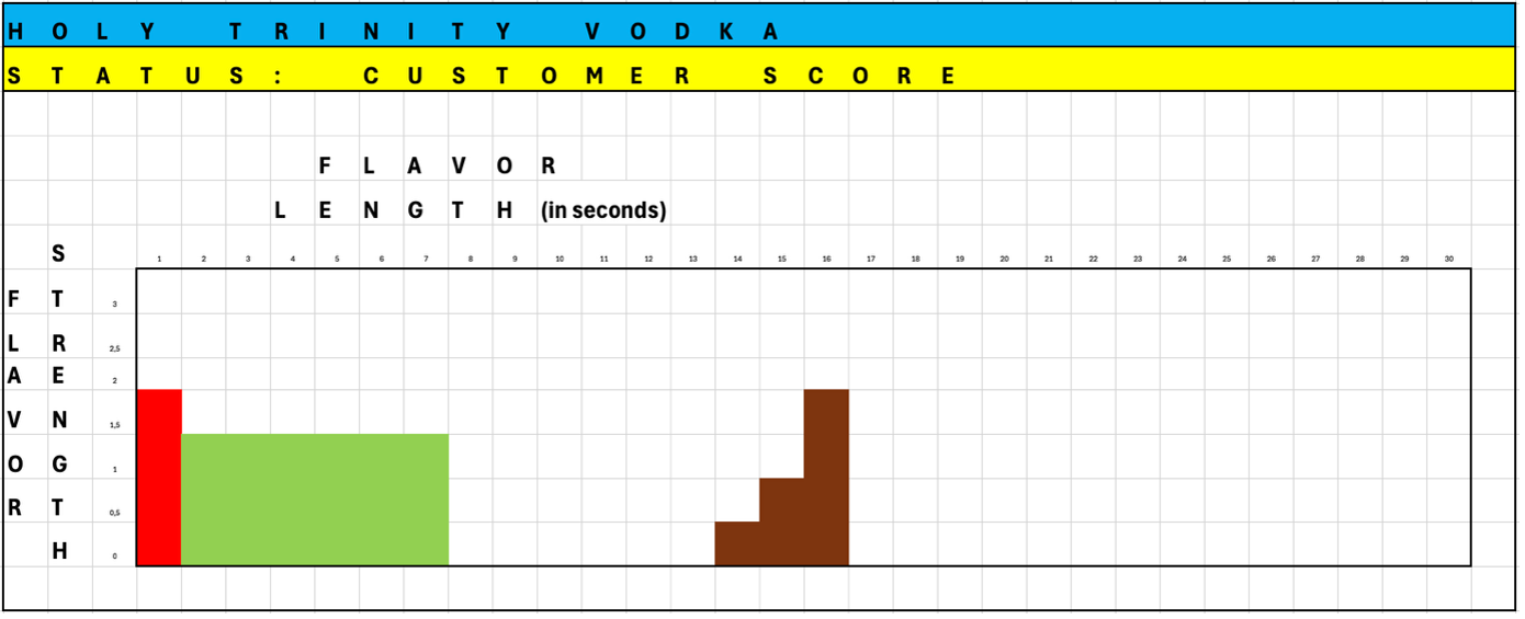 In the representation above the flavor intensities are maximized. In reality flavor strengths are lower for vodka and higher for whisky and rum. Not every color should be of the same intensity. In fact, great product usually has an on-ramp and an off-ramp. A slightly lower “red” and “brown” score, relative to the flavor strength of the hearts.