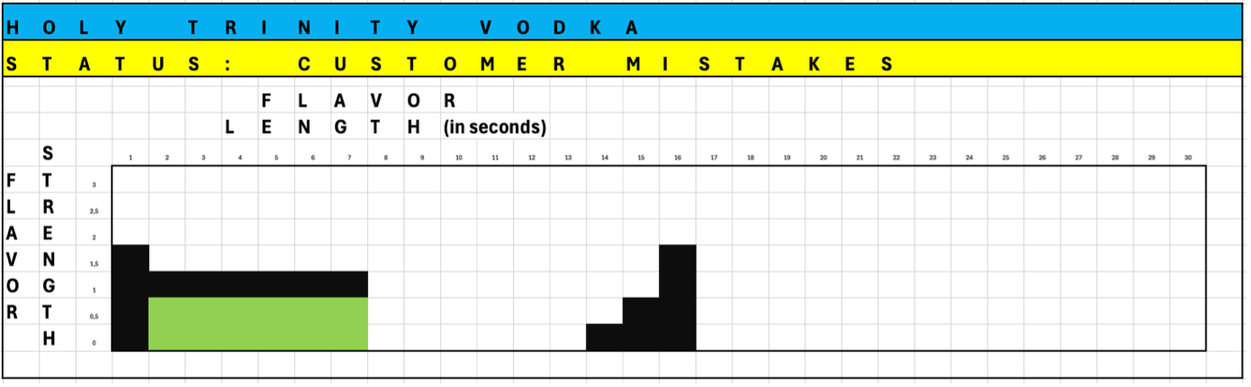 The potato vodka’s mistakes are high-lighted in black in the representation above. As all dimensions are compromised, relative to the optimal flavor profile for vodka, the current result does not deserve any awards. Mind you, this potato vodka might get an award, as the award industry likes to incentivize its customers to participate as often as possible (as they then pay as often as possible), but a spirit that has not even one dimension right, is simply and plainly wrong. And Odin does not hand out awards just for effort.