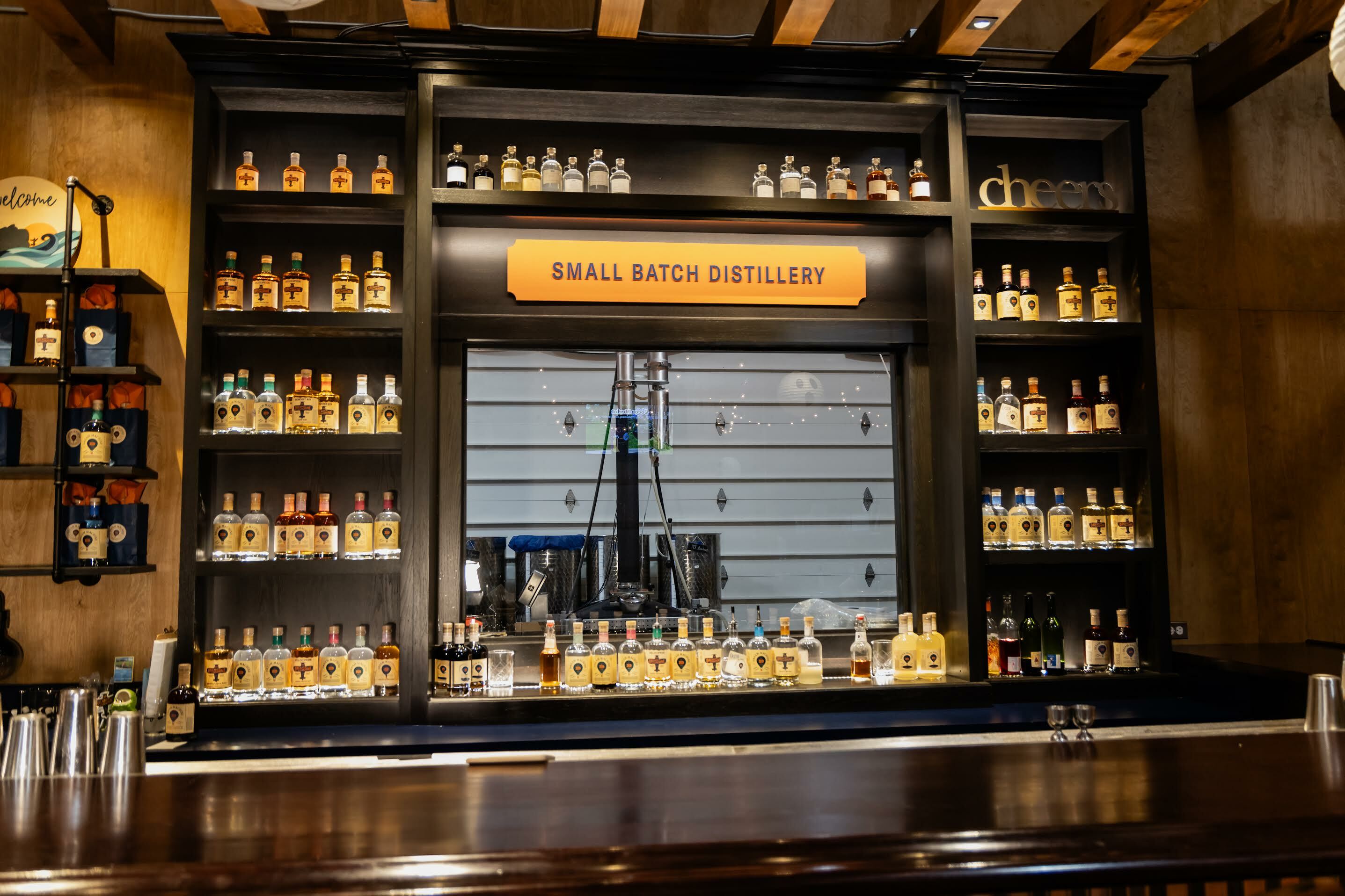 We do. There are a couple places where we do sell it. Although, from the very beginning, even with the beer and wine, we have been focused on the on-premise sales. 99% of all products are sold in-house. We have a public side of the business, which is the taproom. The taproom averages about 1200 people per week throughout the year. Next to that we have the private side, which is the banquets and weddings. Our weddings average about 140 people and typically we have 3 weddings per week. Last weekend we had four, one every day from Thursday to Sunday. That adds up to about 450-500 people per weekend. We have created a business where there is enough demand in-house and we don’t need to go to markets, restaurants or convenience stores to sell our products. On the banquets and weddings, guests can only drink the products that we make, so we don’t need to go outside and find sales there. We could, but realistically, we would make less money on the products if we started wholesaling than what we can make if we sell them in-house. We brew once a week, distill two or three times a week and we make wine throughout the week, so this demand doesn’t stress our small production staff.